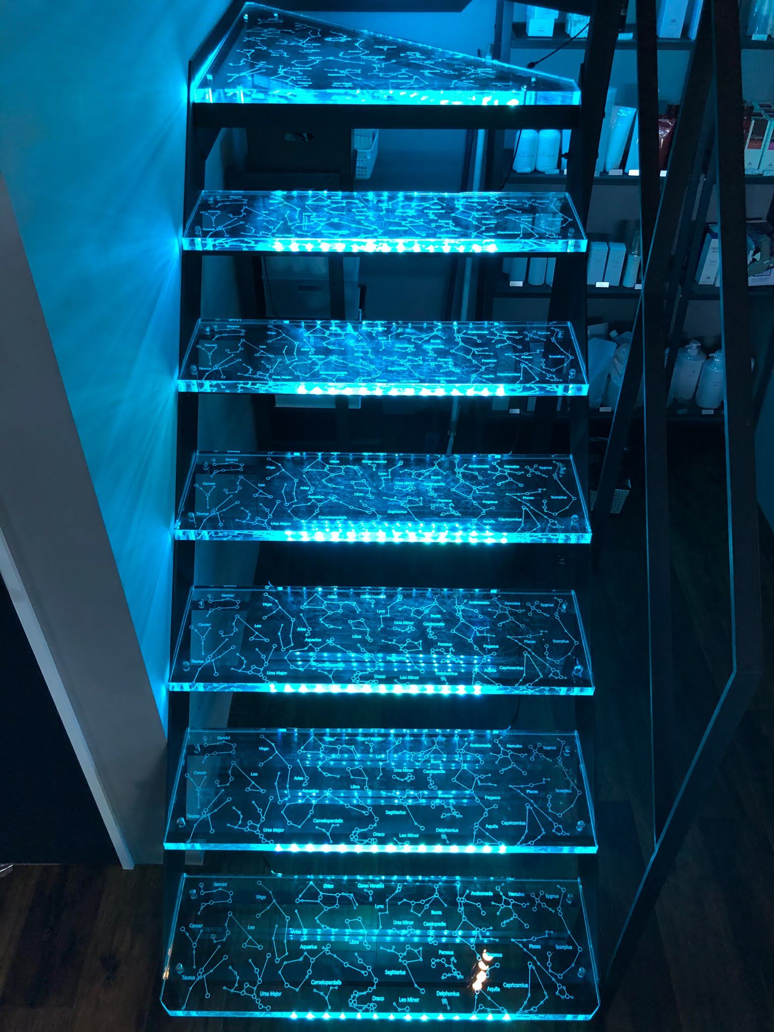 レーザー加工 アクリル階段 長野県御代田町のHAIR SALON +Ziel様の店舗移転に伴い、アクリル製階段の制作依頼をいただきました。 宇宙がコンセプトの内装となっており、階段の踏み板に星座をレーザー彫刻しています。 制作年月日 2020年10月 設置場所 長野県御代田町